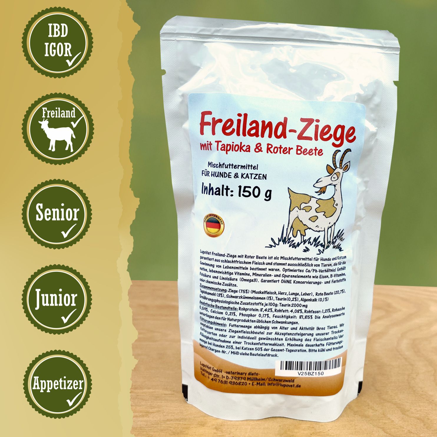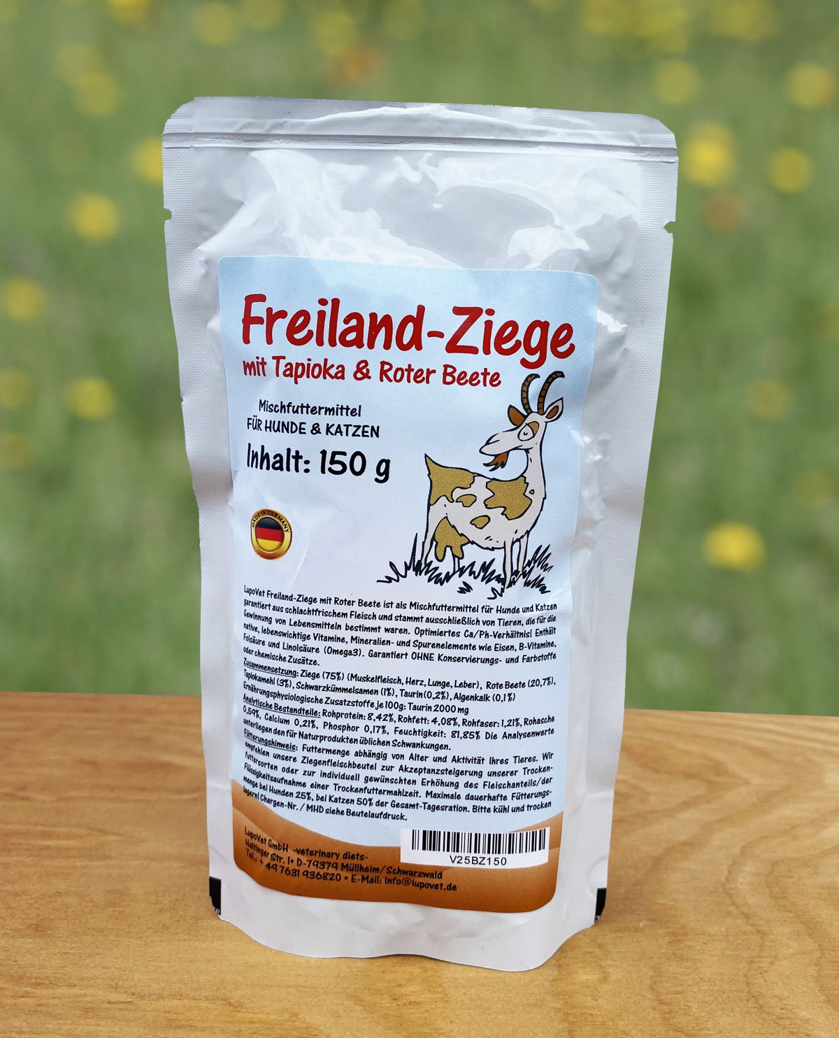 LupoVet Freiland-Ziege mit Tapioka & Roter Beete im 150g Frischebeutel ist als Mischfuttermittel für Hunde und Katzen garantiert aus schlachtfrischem Fleisch und stammt ausschließlich von Tieren aus extensiver Freilandhaltung in der EU, die für die Gewinnung von Lebensmitteln bestimmt waren. Optimiertes Ca/Ph-Verhältnis! Enthält native, lebenswichtige Vitamine, Mineralien- und Spurenelemente wie Eisen, B-Vitamin, Folsäure und Linolsäure (Omega3+6). Garantiert OHNE Konservierungs- und Farbstoffe.