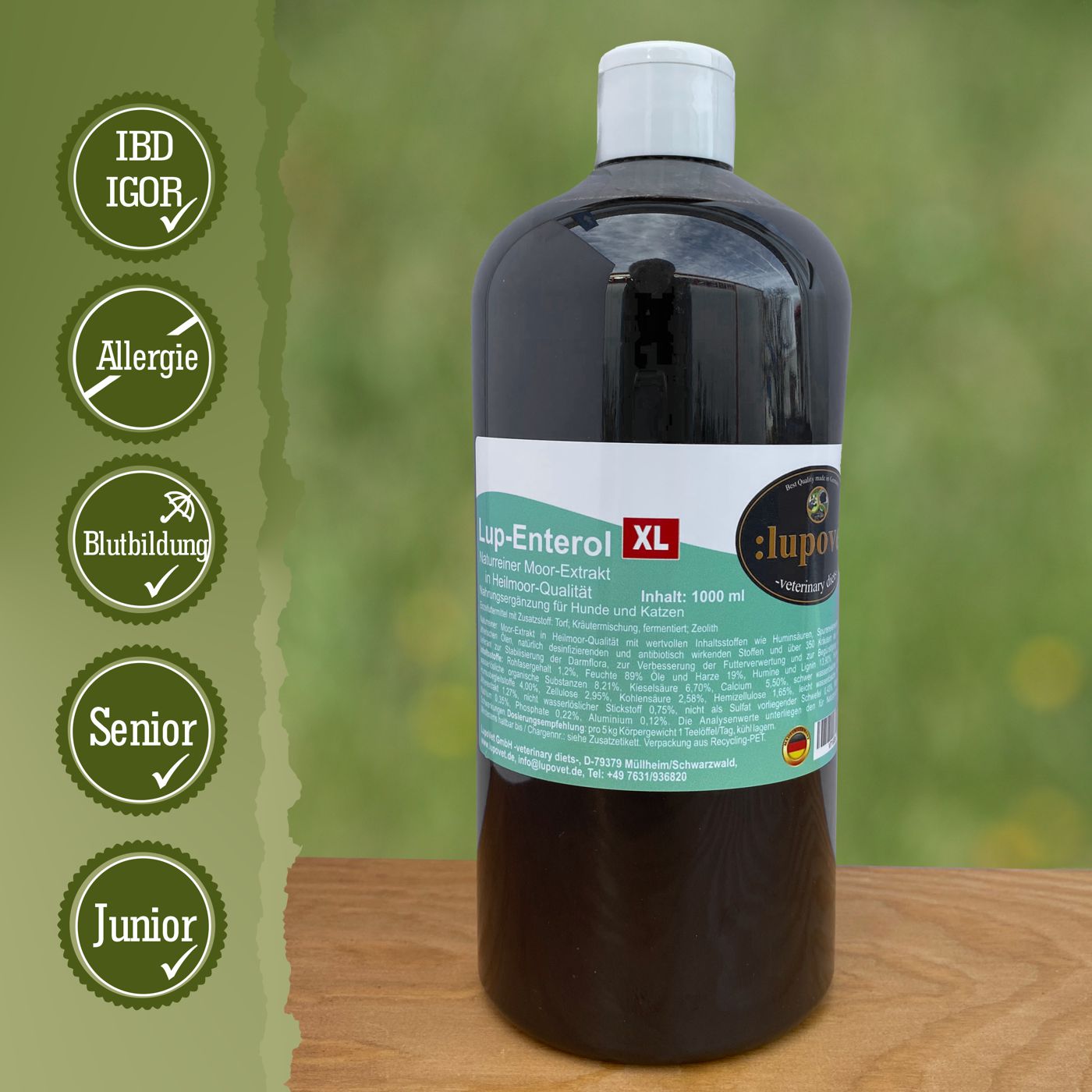 Naturreiner Moor-Extrakt in Heilmoor-Qualität mit wertvollen Inhaltsstoffen wie Huminsäuren, Spurenelementen, Kieselsäuren, ätherischen Ölen, natürlich desinfizierenden und antibiotisch wirkenden Stoffen und über 350 Kräutern als ältester Vitalstofflieferant zur Stabilisierung der Darmflora. Zur Verbesserung der Futterverwertung und zur Begünstigung der Blutbildung. Kann den Kot dunkel färben.