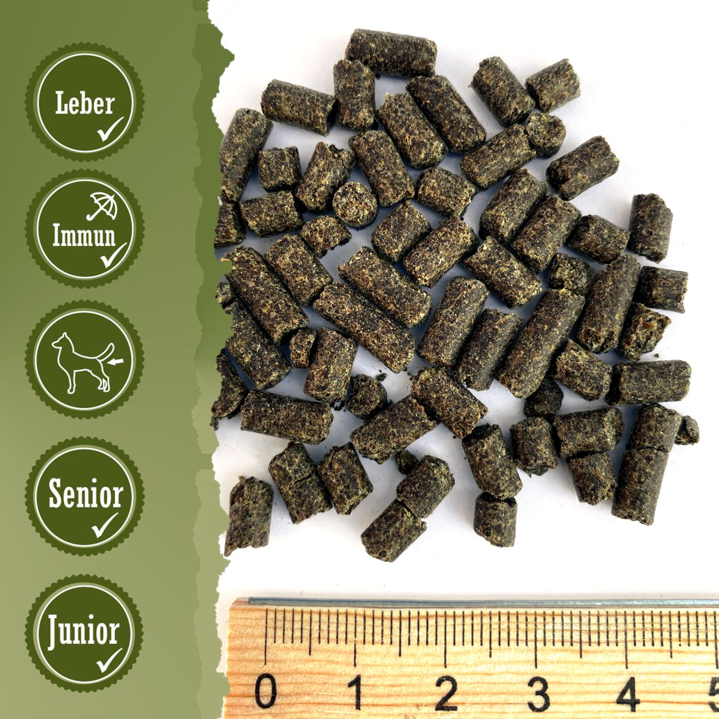 - Dog Support Pellet -- beflügelt Ihren Hund insbesondere bei Belastung und im Alter -hochdosierter Multi-Organ-Komplex mit dem Besten aus der Natur, was ernährungsbedingt Zellen vor Alterung schützen und bei hohen Belastungen unterstützen kann. Garantiert kalt pelletiert. In Pet Bull wirkt ein natürliches vitalisierendes Funktionsorchester.Pet Bull ist der zu 100% natürliche hocheffektive Energie- und funktionale Eiweissquell aus hochwertigen pflanzlichen und tierischen Wirkstoffen: ein Mikronährstoff-Komplex, bestehend aus organ-effektiven sekundären Pflanzenstoffen, Plasmaproteinen sowie funktionalen Peptiden.Pet Bull = Natürlicher Zell-Schutz Von Antioxidation Rosmarienöl, TraubenkernölGelenke Grünlippiger Muschelfleischextrakt, Mangan und MolybdänHerz L-CarnithinImmunsystem Taigawurzel, Zink Leber Artischocke, DL-Methionin, MariendistelNerven Ginseng, B-VitamineVitalität funktionale Plasma-PeptideBis Zellschutz Traubenkerne, Heidelbeere, JiaogulanDie vielfältigen Alterungsanzeichen können durch die in Pet Bull enthaltenen vitalisierenden Mikronährstoffe nachhaltig reduziert werden; Insbesondere bei Antriebslosigkeit oder z.B. zum Darmzellschutz bei chronischen Darmerkrankungen kann es positiv modulierend und ausgleichend wirken und in Situationen körperlicher Anstrengung von Stress und Angst stärken. Erfahrungsgemäß kann Pet Bull schützend gegenüber der Glaskörpertrübung des alternden Auges sein. Pet Bull enthält mit seinem Blutplasma zudem ein wertvolles funktionales Inhaltsstoffspektrum für das Wachstum und die Entwicklung von Welpen. Pet Bull ist erhältlich als 600g-Tüte oder als 100g-Probiertüte.Ergänzungsfuttermittel für Hunde